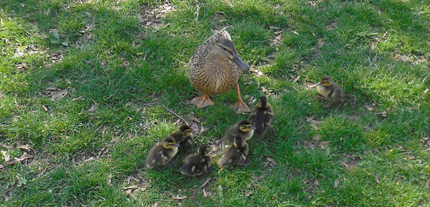 Für gewöhnlich suchen sich Entenpaare ein Plätzchen nahe dem Wasser. Z. B. in Pasing gerne mal auf einer der Würminseln. Dort sind sie dann auch gut geschützt vor den Hunden, die von ihren Besitzern Gassi geführt werden. Aber es geht auch anders... Eine Entemama hat sich wohl überlegt, hoch über dem Boden kann meinen Küken noch weniger passieren und hat sich kurzerhand einen Blumenkasten im 1. Stock unserer Schule als Brutplatz ausgesucht.